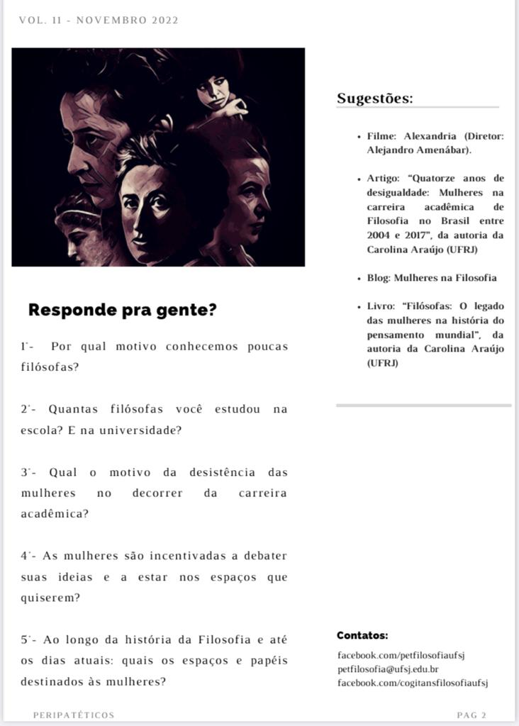 O periPATÉTICOS é um dos projetos de extensão realizado pelo Grupo PET Filosofia, o qual consiste na elaboração e publicação de um periódico cujos temas abordam diversas áreas da Filosofia, como estética, política, artes, etc. 'Peripatético' é a palavra grega cujo significado é 'ambulante' ou 'itinerante'. Os peripatéticos formaram, no passado, um grupo de filósofos seguidores de Aristóteles que praticava o ato de filosofar caminhando pela ágora e pelas ruas da cidade e, por esta razão, o termo foi escolhido para ser o nome do periódico, uma vez que o mesmo é colado em locais públicos. Na cidade de São João del Rei, o periódico assemelha-se aos tradicionais jornais de poste, sendo eles de fácil acesso e de modo que seus leitores possam refletir sobre as temáticas apresentadas enquanto caminham.